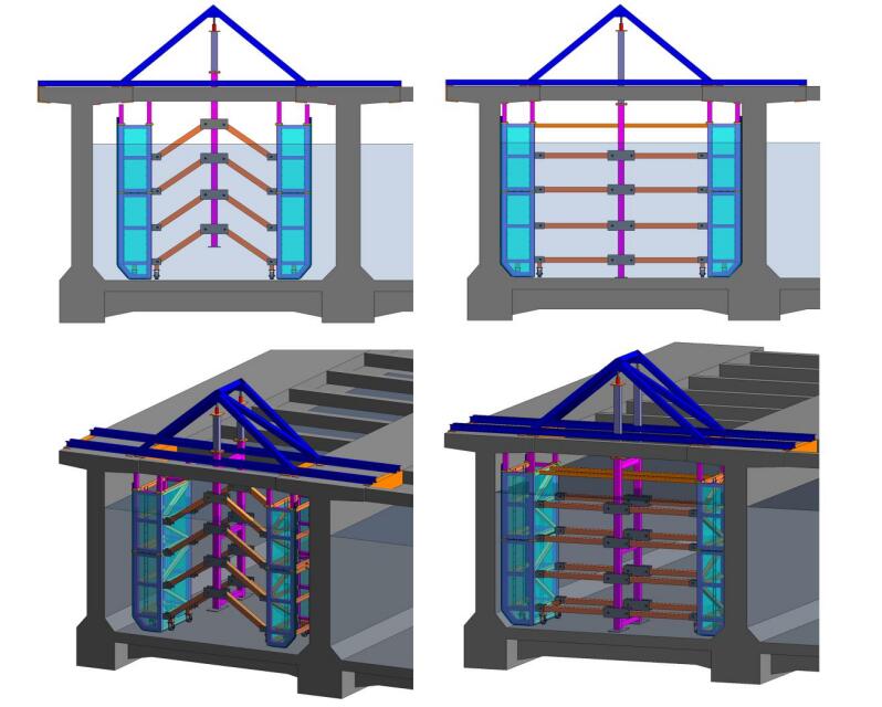 針對大型渡槽結(jié)構(gòu)不中斷輸水施工,巨成結(jié)構(gòu)研究開發(fā)了渡槽施工專用圍堰,通過可伸縮結(jié)構(gòu)將兩側(cè)隔水箱連接,吊裝入水后張開貼緊側(cè)壁,通過高壓水帶形成密封隔水,再兩側(cè)隔水箱內(nèi)水排干,形成干地作業(yè)環(huán)境,由此通過中間過水,兩側(cè)即可進(jìn)行側(cè)壁修復(fù)。對于止水帶修復(fù)的情況,可先更換兩側(cè)隔水箱區(qū)域止水帶,再結(jié)合隔水膜將中間區(qū)域隔水,兩側(cè)過水,將中間區(qū)域形成干地作業(yè)環(huán)境。通過底部行走輪和側(cè)面限位輪,可通過牽引系統(tǒng)將隔水裝置在水下進(jìn)行牽引行走,可做到連續(xù)施工。