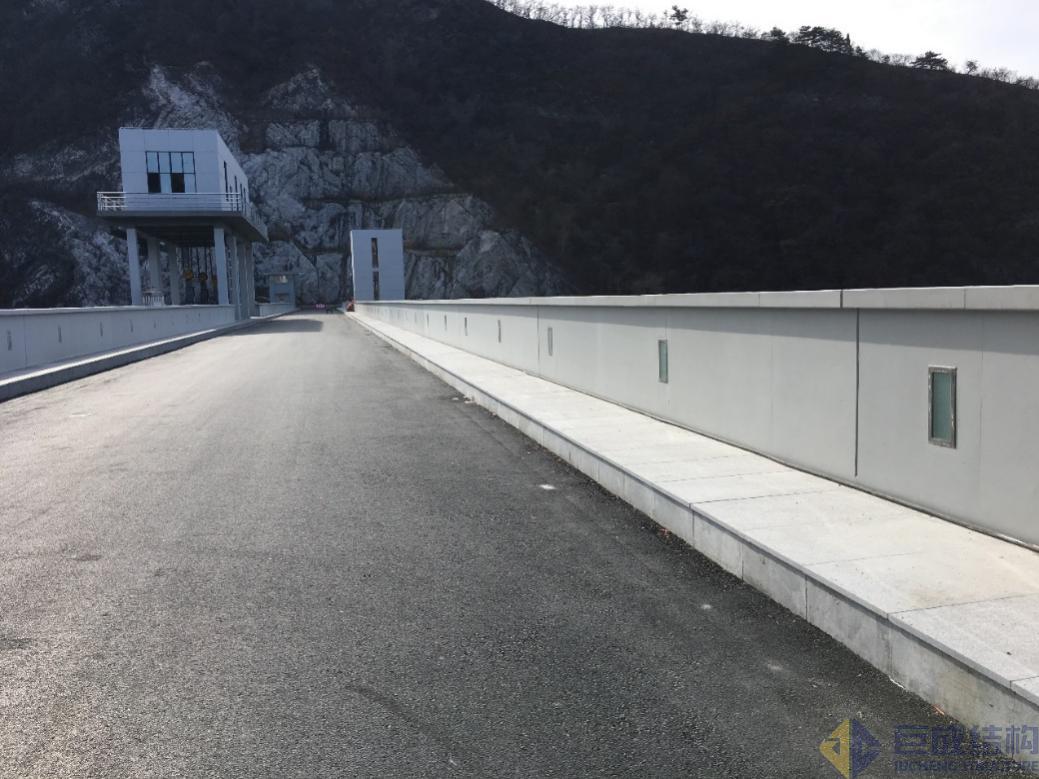 觀音閣水庫是東北著名的大型水庫,壩頂建筑彩鋼板銹蝕嚴(yán)重,大壩其它位置外立面也較為破敗。遼寧省相關(guān)領(lǐng)導(dǎo)在了解清水混凝土效果后,認(rèn)為符合觀音閣大壩整體風(fēng)格。2016年委托巨成結(jié)構(gòu)對(duì)其進(jìn)行改造。溢流壩啟閉機(jī)室外墻采用現(xiàn)澆清水混凝土,大壩采用涂裝清水混凝土,防浪墻采用后澆清水混凝土。大壩改造后山水渾然天成,水庫成為4A級(jí)景區(qū)。