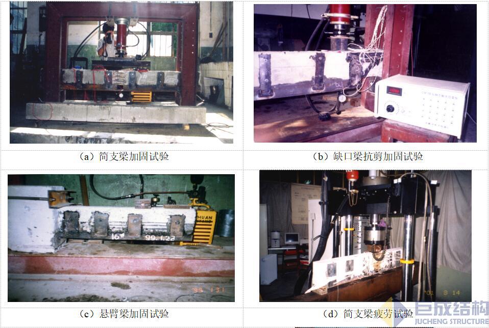 二十年來(lái),巨成結(jié)構(gòu)科研人員對(duì)粘接型鋼加大截面加固法開(kāi)展了相關(guān)理論分析、力學(xué)性能試驗(yàn)研究和數(shù)值分析,包括粘接型鋼加大截面加固簡(jiǎn)支梁抗彎試驗(yàn)研究、粘接型鋼加大截面加固缺口梁端部抗剪試驗(yàn)研究、粘接型鋼加大截面加固懸挑梁抗彎試驗(yàn)研究、粘接型鋼加大截面加固簡(jiǎn)支梁重載疲勞試驗(yàn)研究、粘接型鋼加固混凝土板試驗(yàn)研究等(如圖4),取得了豐富的研究成果,具有理論、試驗(yàn)研究分析和大量實(shí)際應(yīng)用基礎(chǔ)。