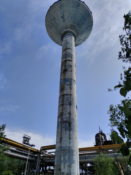 新疆天山鋼鐵巴州有限公司簡稱“巴州鋼鐵”,巴州鋼鐵煉鋼廠內(nèi)有一座事故水塔。水塔為鋼筋混凝土筒體結構,上部主要是倒錐形水箱,水箱檐口直徑14.62米,下部為圓柱形支筒,支筒外徑3.22米,水塔頂高度為43.08米。該水塔建于2011年,歷經(jīng)10余年的風吹雨打、酷暑嚴寒,水塔主體結構有多處老化和損傷,橫豎裂縫總長達187米之多。水塔成為鋼鐵廠的高危建筑,加固水塔成為巴州鋼鐵的一件心頭大事。