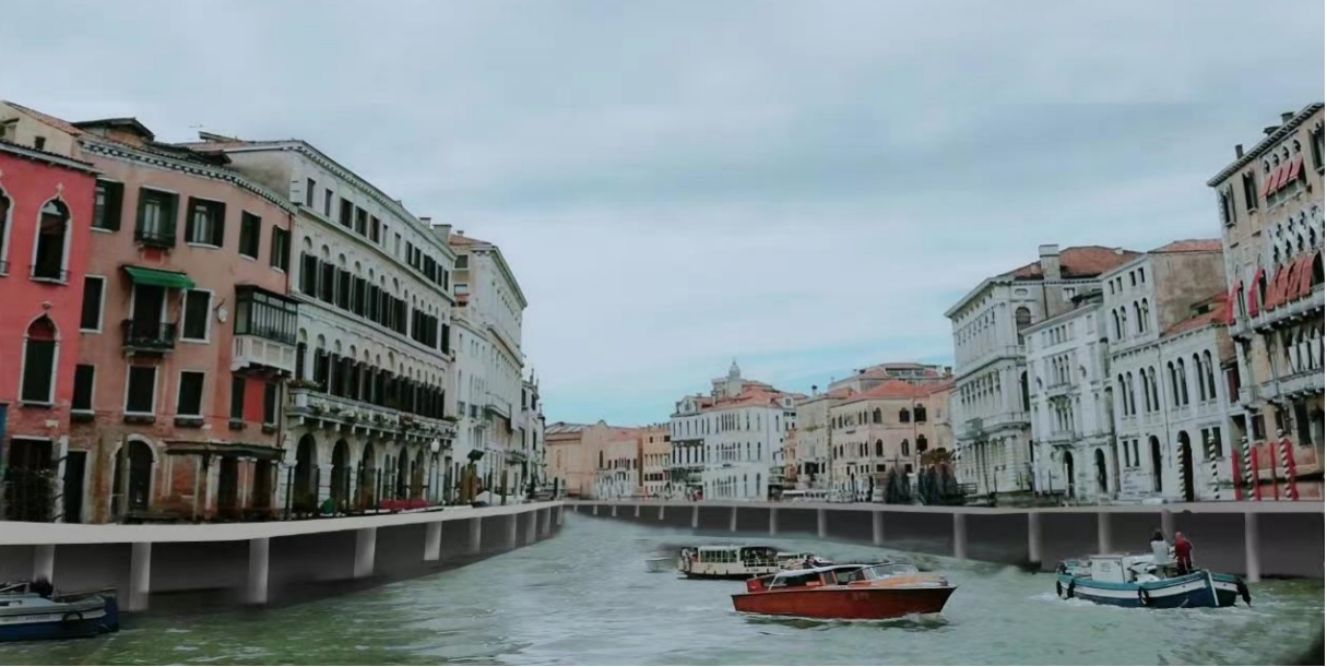 基于此,利用鋼滑道頂升技術(shù)還可能使像威尼斯水城等國際國內(nèi)瀕臨淹沒的重要城鎮(zhèn)通過頂升得到保護(hù)。如圖3為威尼斯水城整體頂升改造方案效果。