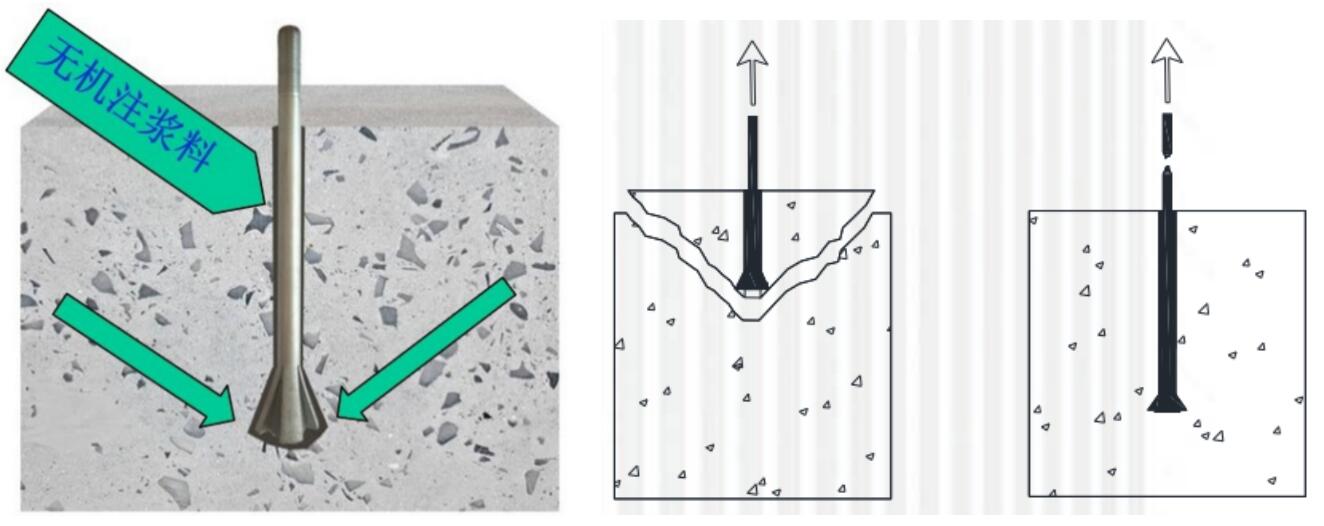 擴(kuò)孔自鎖錨桿只有兩種破壞形式,不會(huì)發(fā)生化學(xué)植筋中的滑移破壞。自鎖錨桿的優(yōu)點(diǎn)是:底部擴(kuò)大形成機(jī)械咬合提供錨固力,錨固深度更淺;灌注無(wú)機(jī)注漿料,不懼溫度和濕度的影響,耐久性與被錨固體一致,克服了化學(xué)植筋不耐高溫、不耐潮濕以及耐久性差的問(wèn)題。