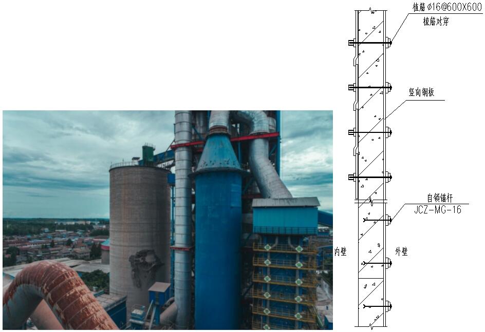 該項(xiàng)?位于湖北省老河口?泥?內(nèi),廠內(nèi)?料均化庫(kù)建成于2009年。庫(kù)容量為2萬(wàn)噸。該庫(kù)于2009年正式投產(chǎn),為?座單體圓形鋼筋混凝?筒倉(cāng)結(jié)構(gòu)。該?料均化庫(kù)庫(kù)體外壁在2021年8?22?突然出現(xiàn)破洞損壞,鋼筋裸露,破壞?積達(dá)到56m2,庫(kù)體因內(nèi)部壓強(qiáng)突變,庫(kù)頂板發(fā)?嚴(yán)重的內(nèi)凹變形,與鋼?房相連接鋼構(gòu)件受拉發(fā)?嚴(yán)重變形以及錯(cuò)位。應(yīng)急處理?式中包括包鋼板加固,包鋼加固中采??鎖錨桿替代化學(xué)植筋后錨固。