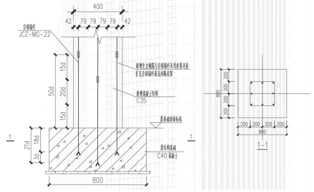 經(jīng)改造加固設(shè)計(jì),對(duì)經(jīng)升級(jí)改造后的屋?結(jié)構(gòu)、吊?梁、柱?進(jìn)?了常規(guī)加固。原設(shè)計(jì)柱加固??房基礎(chǔ)頂?處(即室內(nèi)地坪標(biāo)?以下),由于地?處有設(shè)備影響開(kāi)挖,?法實(shí)施。故調(diào)整設(shè)計(jì)?案:在不破除地坪前提下,??鎖錨桿從地坪打孔?基礎(chǔ)頂?以下錨固深度,代替地?以下原加?截?受拉鋼筋。