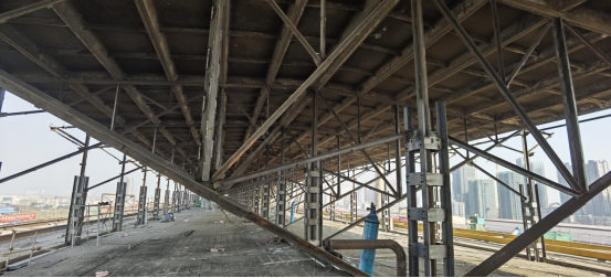 目前,項(xiàng)目部約有200人正緊鑼密鼓地開展鋼天窗架頂降的相關(guān)施工準(zhǔn)備工作,如鋼滑道安裝、天窗架構(gòu)件加固、縱橫向支撐安裝、設(shè)備安裝調(diào)試等。