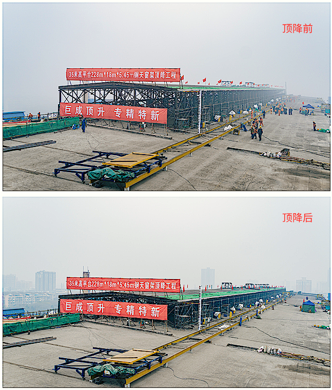 巨成公司成立了頂降專項(xiàng)工程指揮部,經(jīng)過(guò)周密部署和精心設(shè)計(jì),歷時(shí)11個(gè)階段,27小時(shí)奮戰(zhàn)順利將天窗架整體頂降1.945m。這是利用創(chuàng)新技術(shù)解決工程難題的典型案例,創(chuàng)造了大型工業(yè)廠房(長(zhǎng)度達(dá)228m)整體頂降的巨成新紀(jì)錄!